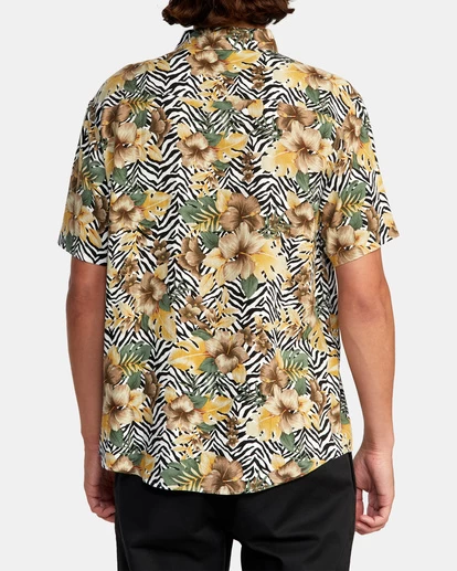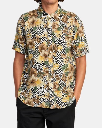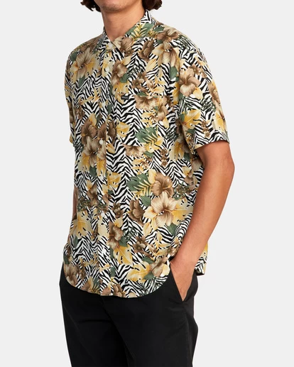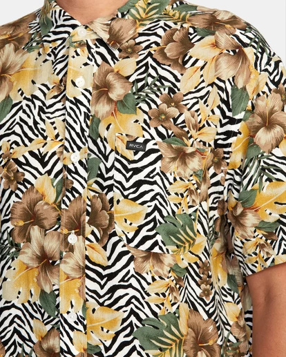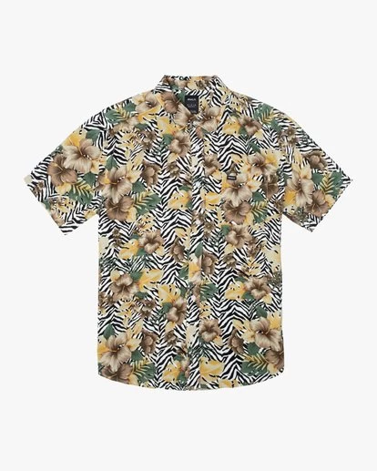 Walk on the wild side in the RVCA Cabana Short Sleeve Shirt. Made from cotton viscose poplin and featuring a bold allover print, this men’s button-down is built with a traditional collar, short sleeves, scalloped hem and chest pocket.