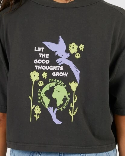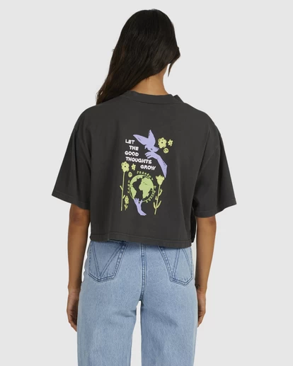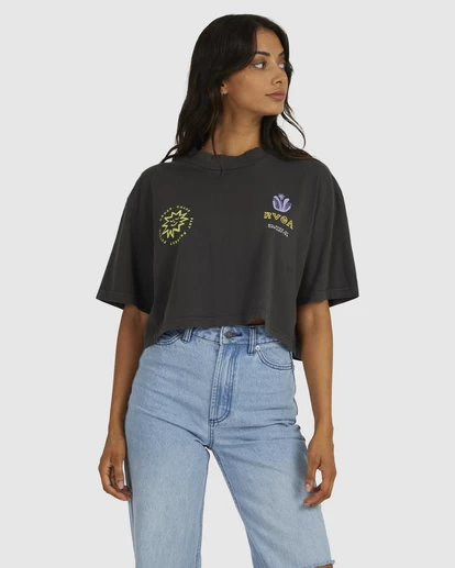 AN OVERSIZED TEE STOLEN FROM THE GUYS AND CUT OFF TO A CUTE WAIST GRAZING LENGTH. THIS CROPPED RUMMAGE TEE HAS A DROPPED SHOULDER AND EXTRA WIDE NECK BAND. FEATURING A DOUBLE CHEST PRINT AND BACK PRINT, FINISHED WITH A HEAVY WASH FOR A VINTAGE LOOK AND FEEL.