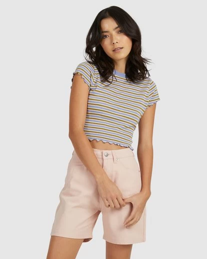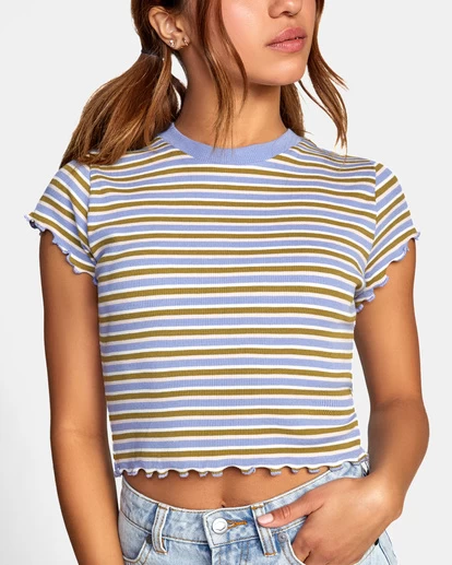 TAKING 90S RETRO STYLE INTO THE HERE AND NOW WITH PREMIUM ECO-FRIENDLY FABRICS, THE CLASSMATE CROP TEE YOUR NEW BFF. THIS WOMEN’S SHORT SLEEVE T-SHIRT FINDS ITS FLOW IN A BLEND OF RIBBED VISCOSE KNIT THAT FEELS SUPREMELY SOFT AND ALWAYS COMFORTABLE. THE CROPPED FIT IS STYLED WITH BABY MERROW RUFFLES AT THE HEM THAT KEEP IT FUN AND FEMININE. WHETHER YOU OPT FOR STRIPES OR SOLIDS, THIS TEE WILL QUICKLY BECOME ONE OF YOUR GO-TOS.