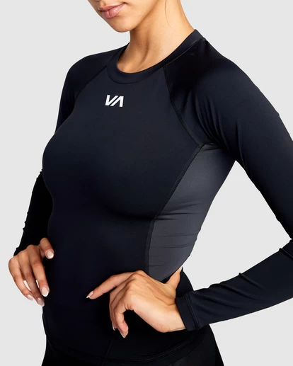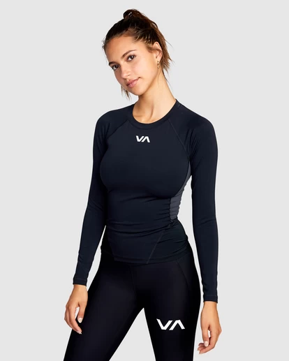 DELIVERING CORE DESIGN AND ATHLETIC PERFORMANCE, THE RVCA COMPRESSION LONG SLEEVE WORKOUT TOP FOR WOMEN IS BUILT FROM MOISTURE-WICKING, ANTI-MICROBIAL FABRIC MADE FROM RECYCLED FIBERS, KEEPING YOU DRY AND ODOR-FREE. STRETCHY AND SUPPORTIVE, THE WORKOUT SHIRT FOR WOMEN IS STREAMLINES YOUR TRAINING SESSIONS WITH A FITTED CUT, ADDING A BACK MESH PANEL FOR ADDED BREATHABILITY AND THERMAL REGULATION. PART OF THE VA SPORT COLLECTION, THE WOMEN’S COMPRESSION TOP IS FINISHED WITH A VA LOGO AT THE CHEST AND RVCA LOGO AT THE BACK NECK.