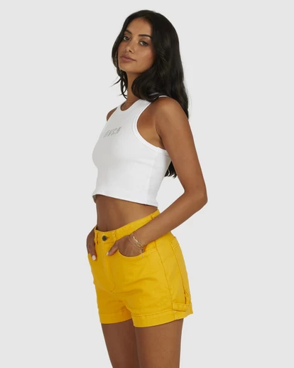 ITS THAT Y2K NOSTALGIA AND ITS BACK IN FORCE. A CLASSIC WHITE CROPPED TANK IS A STAPLE IN EVERY WARDROBE, BUT A RVCA RHINESTONED TANK IS AN ESSENTIAL ADDITION. THE DAZZLE TANK, MADE FOR YOU.