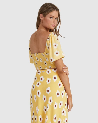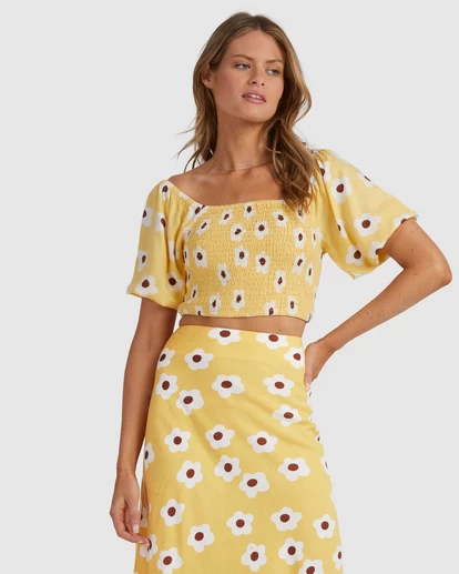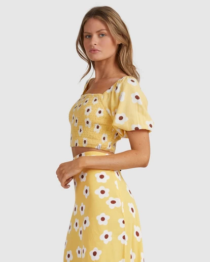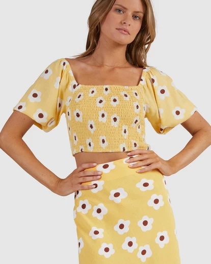 THE GOGO TOP HAS A FULLY ROUCHED BODICE FOR COMFORT AND STYLE, FEATURING A CUT PUFF SLEEVE WITH ELASTICATED HEM. THE CROPPED LENGTH IS PERFECT TO PAIR BACK WITH THE GOGO JUNE MAXI SKIRT OR YOUR FAVOURITE DENIM.