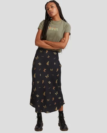 MADE FOR THOSE WHO ARE CONSTANTLY EVOLVING, THE FLUTTER ANNIKA SKIRT LOOKS GOOD NO MATTER WHICH PHASE YOU’RE IN. THE WOMEN’S MIDI SKIRT MADE WITH SILKY SOFT VISCOSE OFFERS A SLIM FIT WITH A HIGH WAIST. FEATURING AN INVISIBLE ZIP FOR EASY ON AND OFF, THE SKIRT FROM OUR RVCA X MEL G COLLECTION FEATURES AN EXCLUSIVE ARTIST PRINT.
