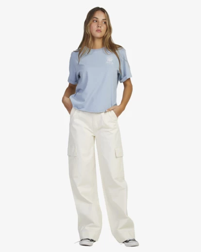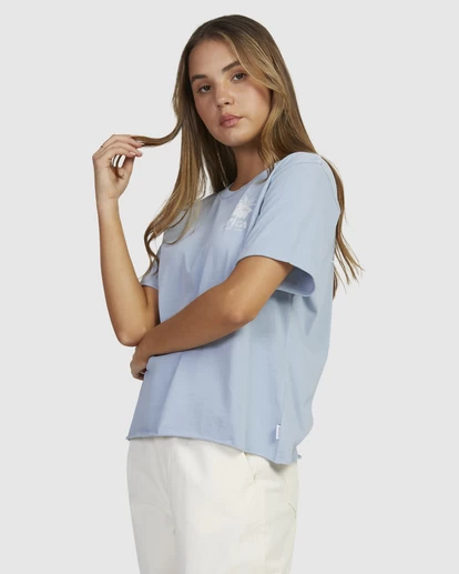 THE WOMEN’S RVCA RADIO PALMS CUFFED TEE IS A REGULAR FIT TEE. MADE FROM PREMIUM COTTON JERSEY, IT FEATURES EXCLUSIVE RVCA SCREEN PRINTS ON THE FRONT BACK AND COMES IN A DUSTY BLUE COLOURWAY. PERFECT FOR SUMMER DAYS!
