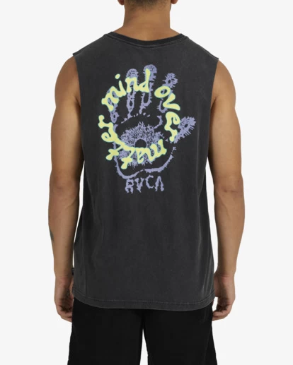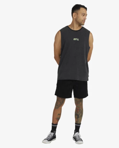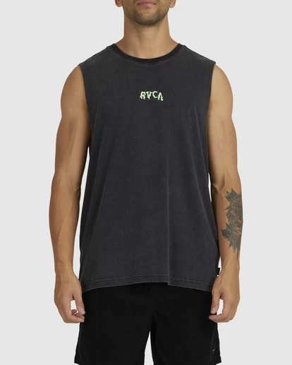 THE RVCA SLAP MUSCLE DELIVERS A THROWBACK STYLE WITH ITS UNIQUE ACID WASH TREATMENT AND YOUTHFUL LOGOS ON A PREMIUM VINTAGE MID-WIGHT JERSEY BASE. THIS GARMENT DYED MUSCLE FEATURES LEFT CHEST AND LARGE BACK PLASTISOL SCREENPRINTED GRAPHICS, A WIDER RIBBED NECK AND FINISHED WITH A SMALL FLAG LABEL SEWN INTO SIDE SEAM.