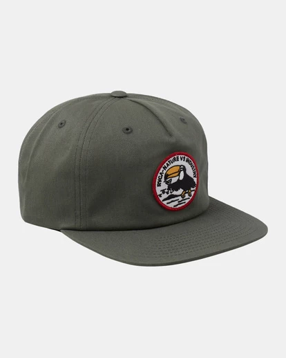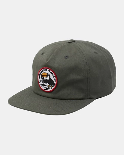 Made of durable cotton twill, this unstructured snapback hat has an RVCA woven patch at the front and an adjustable back closure.