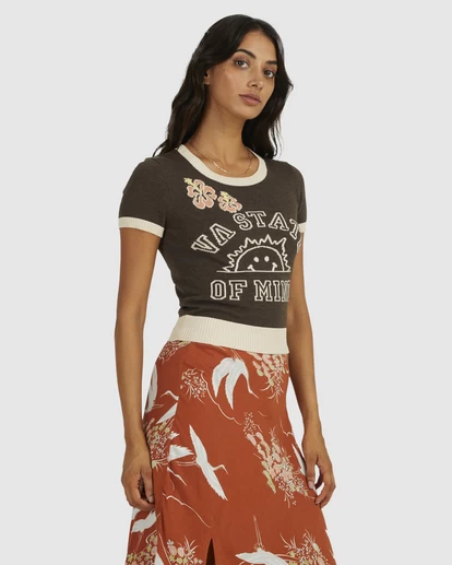 THE VA STATE SWEATER IS A LIGHTWEIGHT KNITTED TEE FEATURES CONTRAST HEM AND NECK BANDS AND IS MADE OF SOFT COTTON WITH A LIGHT HAND FEEL. OFFERING A SLIM FIT, THE SHORT SLEEVE TOP FEATURES KNITTED INSTARSIA ART ON THE FRONT CHEST FOR A TOUCH OF PLAYFULNESS. SIZE UP FOR A MORE RELAXED FIT.