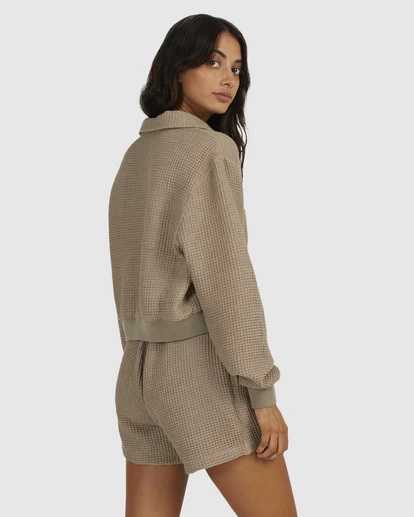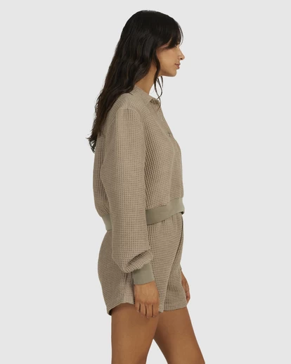 WHETHER YOU’RE IN FOR A DAY ON THE COUCH, A SUNDAY STROLL OR CHILLIN’ WITH FRIENDS, THIS LITTLE BEAUTY IS AN ELEVATED VERSION OF YOUR CLASSIC POLO. THE WOMEN’S WAFFLE JERSEY FEATURES A PLACKET FRONT OPENING WITH COLLAR, RELAXED BOXY FIT AND WAIST GRAZING LENGTH AND RIBBED HEMS. PAIR IT WITH THE WAFFLE POPS SHORT FOR A CUTE CO-ORD SET.